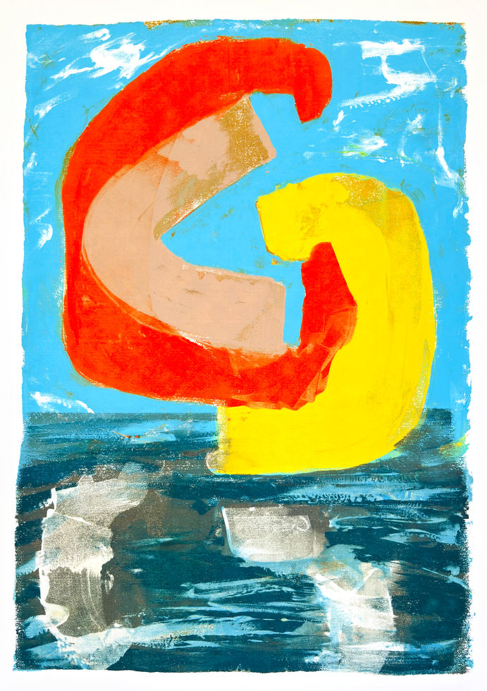 This series of monotypes has evolved from a chance encounter. A conversation about four works by Terry Frost called the SS series. It peaked my interest fishing fleet registration codes and started me down a path thinking about sea monsters and visions sailors see or think they have seen. Of mirages and denizens. This is a series of screen printed monotypes.
